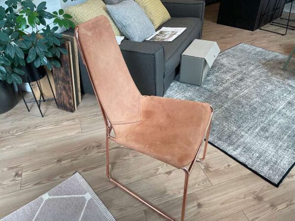 Gestell aus hochwertigen Rose-Gold Lackierung mit Sitzfläch in Vintage-Leder in Farbe braun. Eine elegante Linie, leicht luftig und zart. Kleine Spuren im Leder, da es ein weiches Vintage-Leder ist und mit der Zeit Struktur und Leben übernimmt. Aber das macht das Leder erst so richtig interessant.