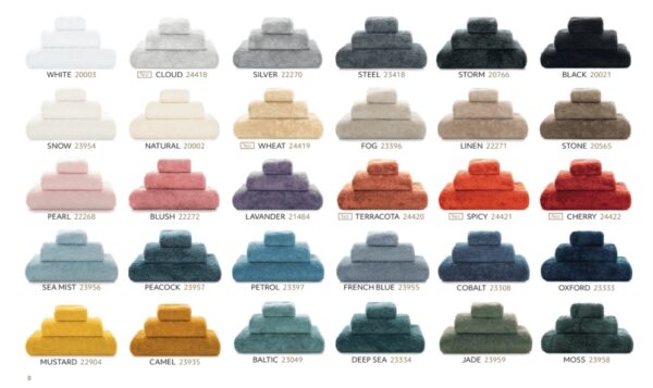 - Programm erhältlich in: Waschhandschuh, 2 Seifentücher-Größen, Handtuch, Duschtuch, Badetuch, Bademantel und passende Badematten