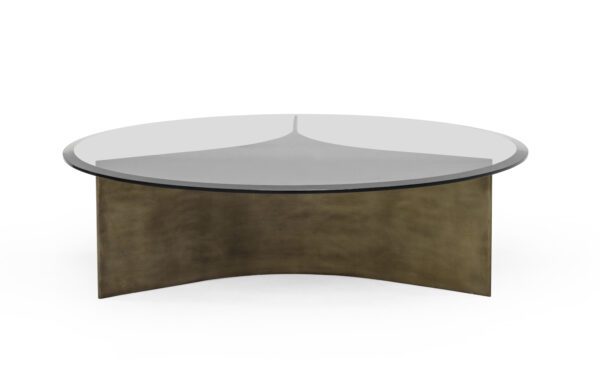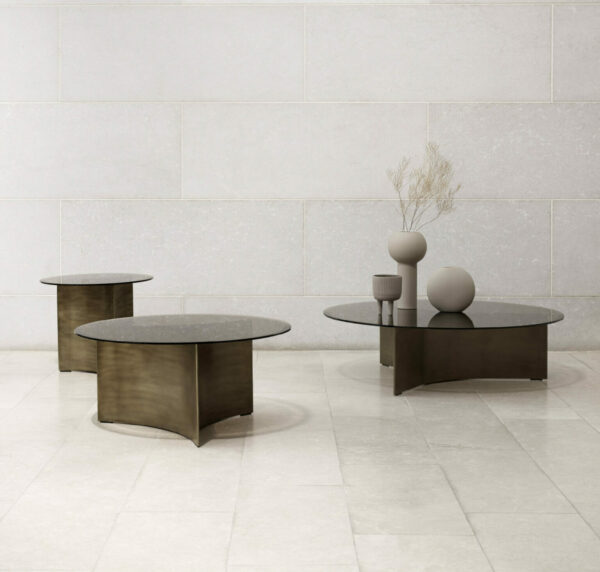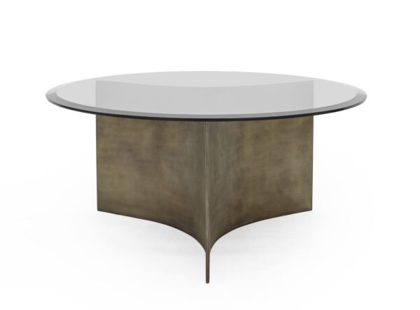 Auf den ersten Blick wirkt der Tisch sehr massiv, bei genauerem Hinsehen zeigt sich aber der skulpturale Charakter. Das Gestell wird aus einfachen Stahlelementen gefertigt, die Verarbeitung und die Bronze-Patina zeigen aber die hohe Handwerkskunst. Die schlichte Platte aus Rauchglas setzt das Gestell perfekt in Szene und wirkt dabei elegant und zeitlos.